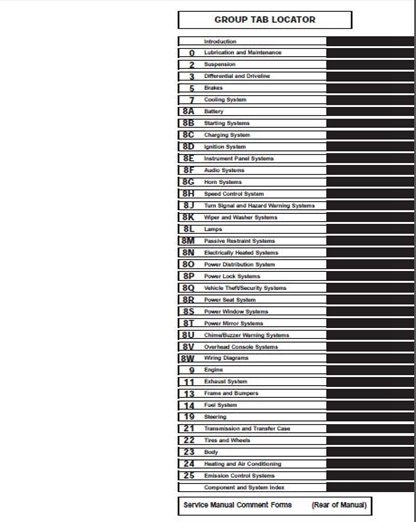 Information in this manual is divided into groups. These groups contain general information, diagnosis,testing, adjustments, removal, installation, disassembly, and assembly procedures for the systems and components.To assist in locating a group title page, use the Group Tab Locator on the following page. The solid bar after the group title is aligned to a solid tab on the first page of each group. The first page of the group has a contents section that lists major topics within the group. If you are not sure which Group contains the information you need, look up the Component/System in the alphabetical index located in the rear of this manual.