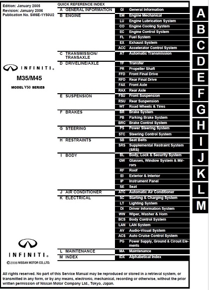 The Infiniti M35 M45 Service Manual contains in-depth maintenance, service and repair information for the Infiniti M35 M45 from 2006. The aim throughout has been simplicity and clarity, with practical explanations, step-bystep procedures and accurate specifications. Whether you’re a professional or a do-it-yourself Infiniti owner, this manual helps you understand, care for and repair your Infiniti.