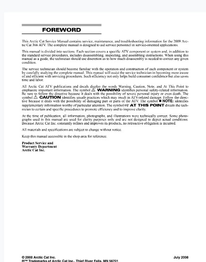 This Arctic Cat Service Manual contains service, maintenance, and troubleshooting information for the 2009 Arc-tic Cat 366 ATV. The complete manualis designed to aid service personnelin service-oriented applications