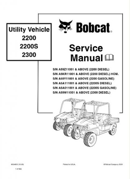 Download Bobcat 2200, 2200S, 2300 Utility Vehicle Service Manual, can easily help you with any repairs that you may need to do. Manual contains step-by-step procedures, detailed illustrations, diagrams, and explanations that will guide you through your servicing and repairing of your Bobcat vehicle.