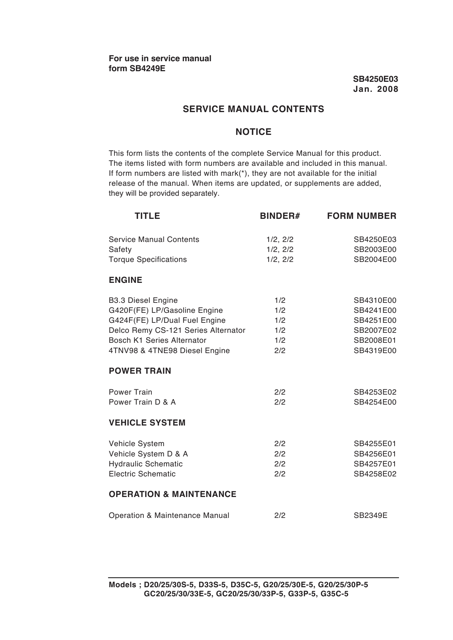 Doosan D20S-5 D25S-5 D30S-5 D33S-5 D35C-5 G20E-5 G25E-5 G30E-5 GC20E-5 GC25E-5 GC30E-5 GC33E-5 G20P-5 G25P-5 G30P-5 G33P-5 G35C-5 GC20P-5 GC25P-5 GC30P-5 GC33P-5 Fork Lift Service Manual
