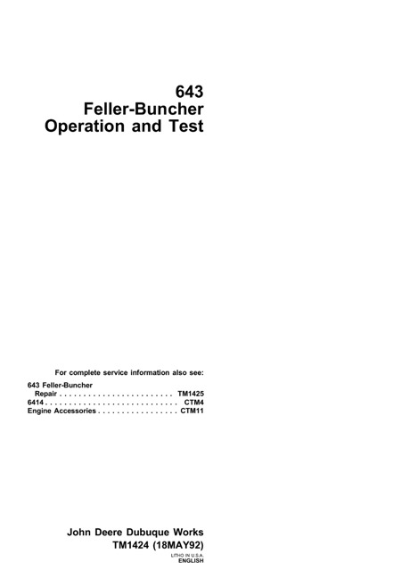 Download Complete Technical & Repair Manual for John Deere 643 Feller-Buncher Operation and Test.