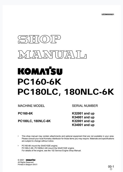 Komatsu Pc160-6k, Pc180lc-6k, Pc180nlc-6k Excavator Shop Manual