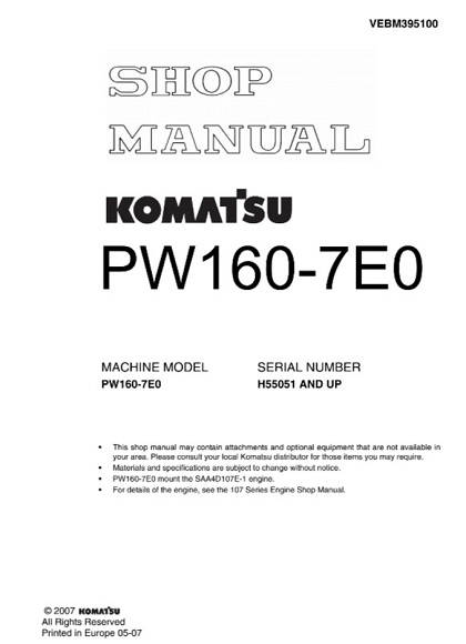 Download Complete Shop Manual for Komatsu PW160-7E0 Hydraulic Excavator.