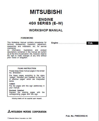 This Workshop Manual contains procedures for removal, disassembly, inspection, adjustment,reassembly and installation, etc. for service mechanics.Using this repair manual is a cheap way to get your Mitsubishi working properly. All pages are printable, just run to your needs and then take them with you into the garage or workshop.
