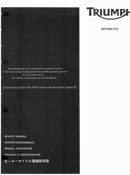 Download 2006-2011 Triumph Daytona 675 Service Repair Manual PDF, This is the same type of service manual your local dealer will be used when doing a repair. With this service manual on hand can easily assist you in any repairs that you may need for your Triumph Daytona 675 Machine.Manual contains step-by-step instruction, diagrams, illustration, disassembly,reassembly,and specifications to repair and troubleshoot.And explanations that will guide you through your servicing and repairing of your motor vehicle.